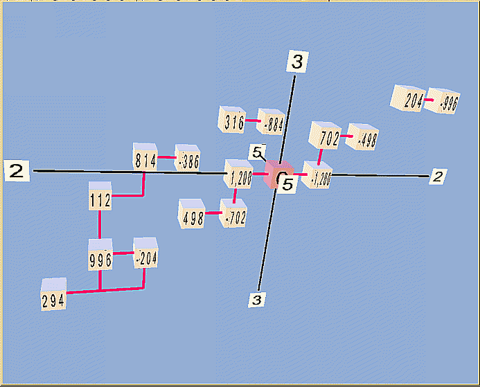 Below is a lattice of the system in 2,3,5-prime-space. Each monzo in the graph above determines the location of the pitch's cube in the lattice; the cubes are labeled with cents-values. The x,y,z axes represent respectively the prime-factors 2, 3, and 5.