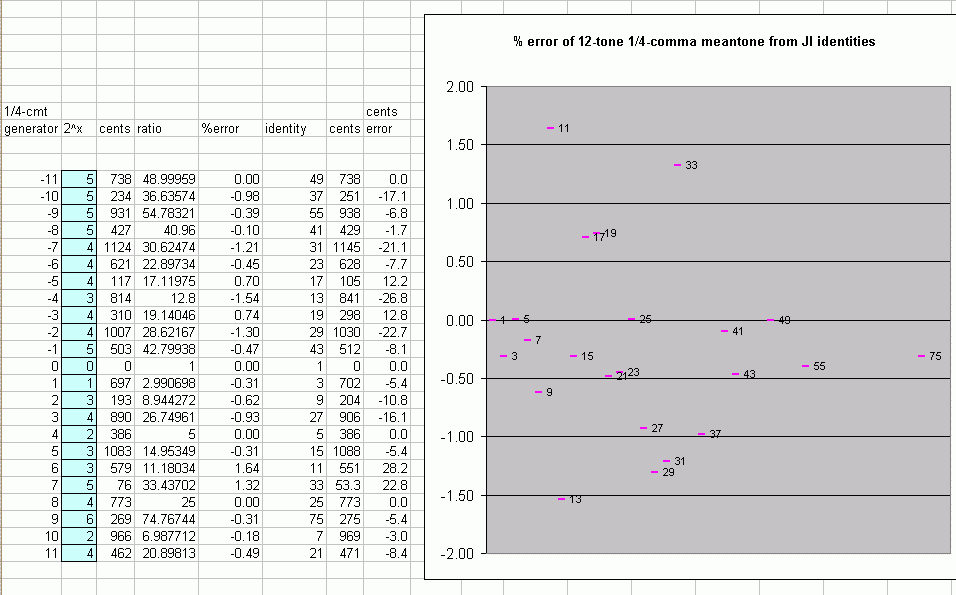 Below is a table and graph showing how closely a 31-tone set of 1/4-comma meantone approximates JI chord identities.