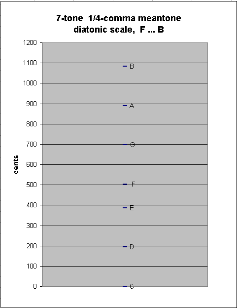 As far as I'm concerned, this is enough to justify listing Aaron's instructions as a description [of] the procedure for obtaining 1/4-comma meantone -- as various authors have done, and Paul [Erlich] does in his table. Further, Aaron adds after his C-G-D-A-E series of fifths that F should be tuned by a similar but opposite procedure, making F in the fifth F-C "a little high, passing a bit beyond perfection." If one assumes symmetry, then 1/4-comma meantone indeed results.