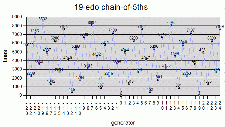Below are graphs of the tina-values for some of the EDO chain-of-5ths tunings in the above table: